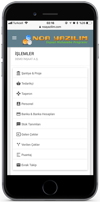 NOA İnşaat Muhasebe Programı ana modüle ek olarak mobil kullanım avantajları sunmaktadır. Ofis dışında yapılan harcamaların programa zamanında girilmesi,Fiş ve fatura gibi evrakların programa eklenmesi,personel kayıt işlemleri, fiş,fatura vb. evrakların anında fotoğraflanım programa eklenmesi gibi birçok özellikler sunmaktadır. Öncelikle belirtmemiz gerekir ki; NOA MOBİL uygulaması ana programın mobil versiyonu olmayıp, her geçen gün arttırılan ek modüller ile programa yardımcı bir uygulamadır.Uygulama ile şantiyelerde yapılması gereken birçok işin bilgisayar başında olmadan telefon ile hızlı birşekilde işlenmesi amaçlanmıştır.